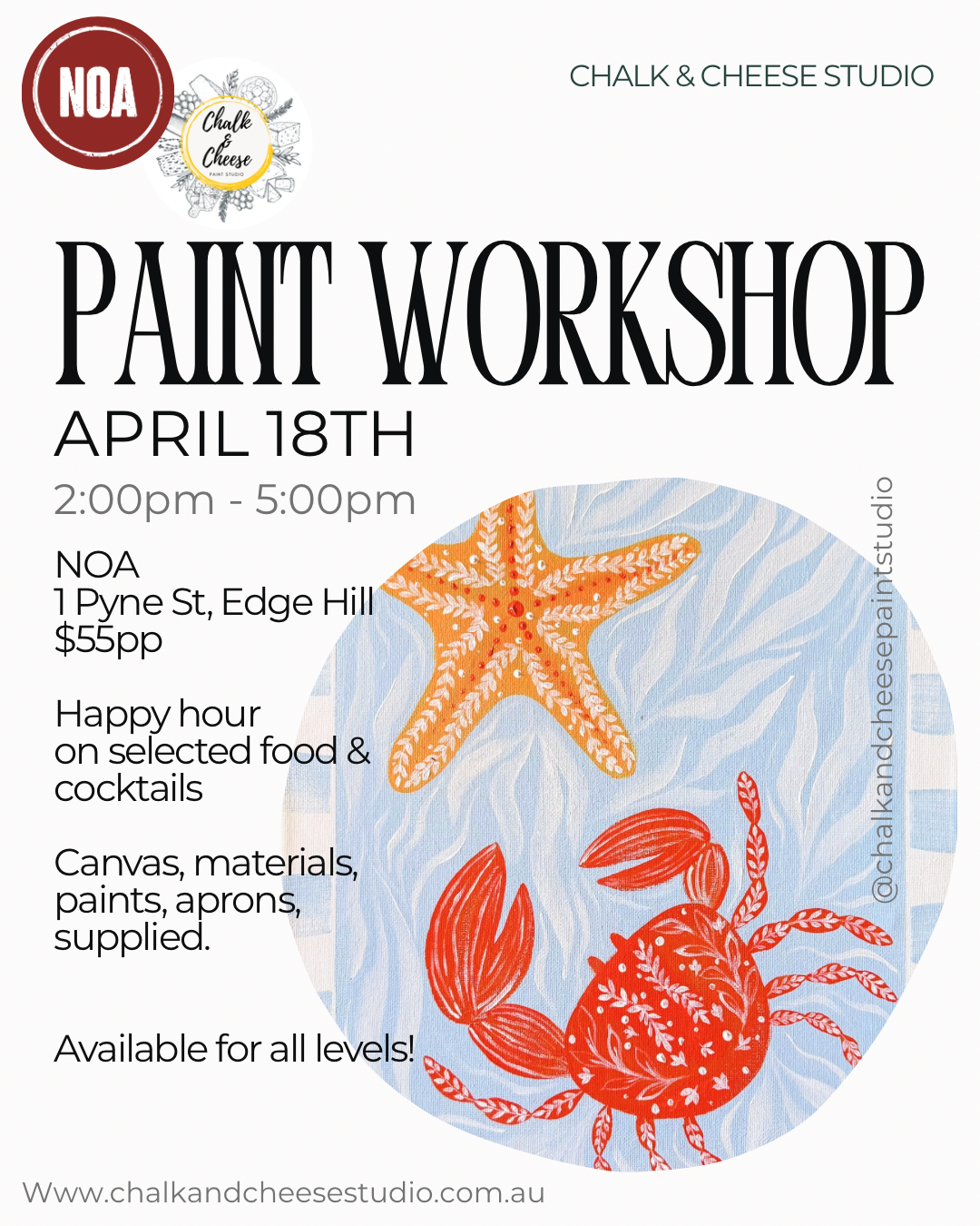Join us at our newest venue NOA for a creative afternoon of painting. Where your host will guide you through this gorgeous ocean themed canvas painting.